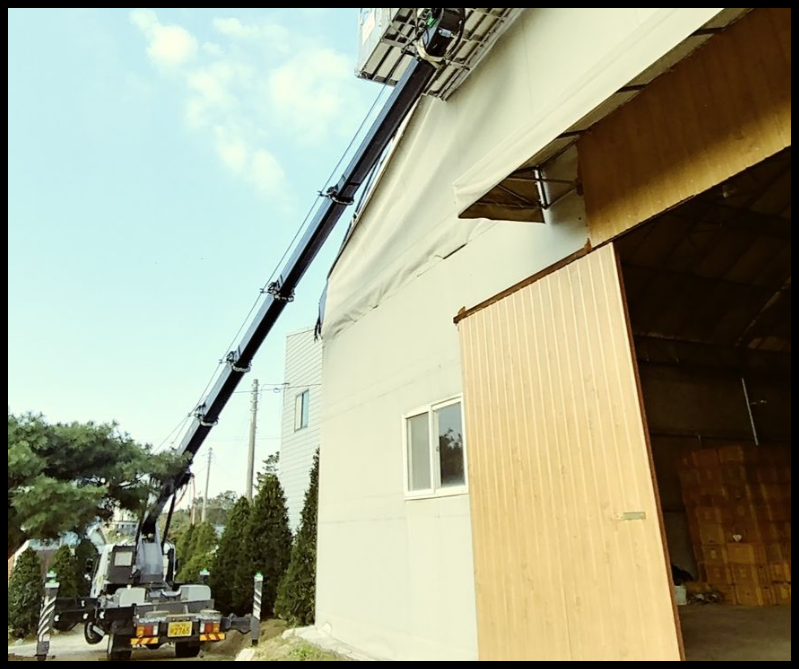 일명 고소작업차라고 하는 스카이차는 간판을 달거나 코킹작업(외벽실리콘)